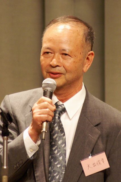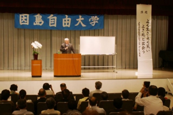 大出俊幸学長は因島重井町出身。田熊中教諭時代の教え子らが中心になって自由大学を支えてきた。「教師時代の想いをみんなが受け継いでくれてうれしい」と感慨ぶかげに会場に向かって語りかけた。