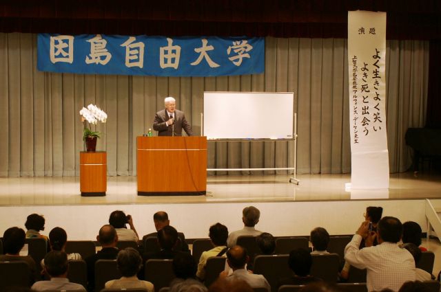 第13回因島自由大学(大出俊幸学長)が14日、因島土生町の芸予文化情報センターで開かれ、島内外から200人が出席した。今回の講師はアルフォンス・デーケン上智大名誉教授で、「よく生き、よく笑い、よき死と出会う」をテーマに講義を行なった。