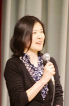左からアルフォンス教授、司会の女性、大出俊幸因島自由大学学長。