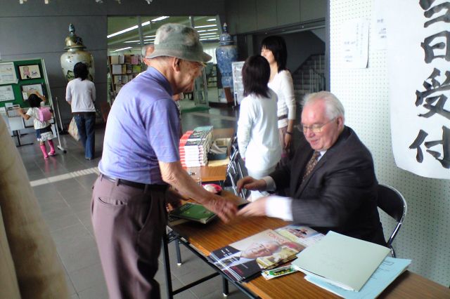 「サインしましょうか?」と著書の購入者に声をかけるアルフォンス教授。